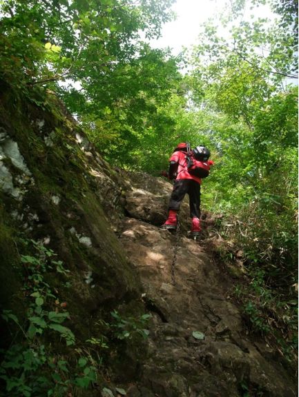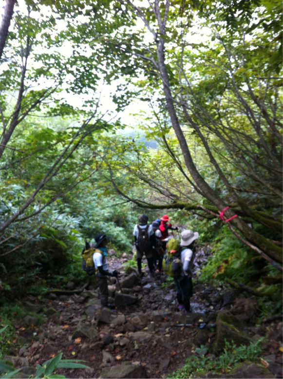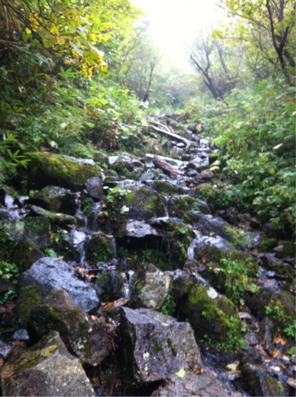 下山は水が流れる沢を、落石を起こさない様に慎重に下り、