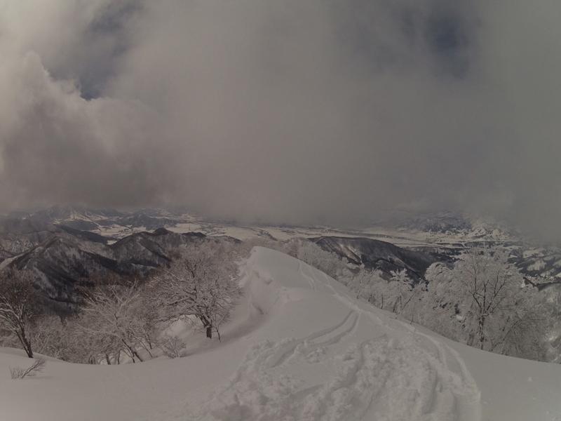 山のピークから横へ横へ、落ちない様に、迷わない様に尾根をトラバースし、時には板を外してハイク。