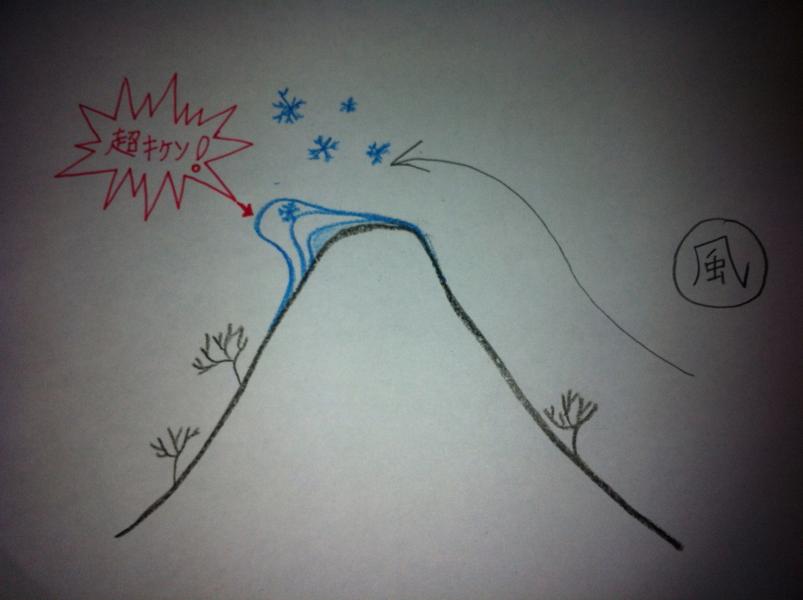 山の右から左へ普段風がよく吹く事によって風で飛ばされて来た雪が 山の左側に何日もかけてくっついて行き、それが蓄積して 巨大な雪のカタマリが身を乗り出し、何の支えもない状態でいつ落ちてもおかしくない。これが雪庇。
